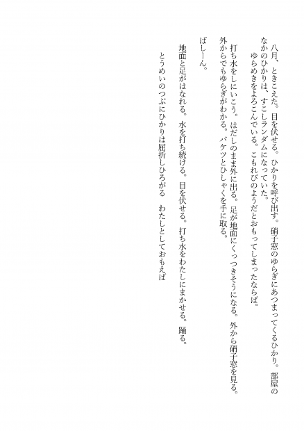 八月、ときこえた。目を伏せる。ひかりを呼び出す。硝子窓のゆらぎにあつまってくるひかり。部屋のなかのひかりは、すこしランダムになっていた。